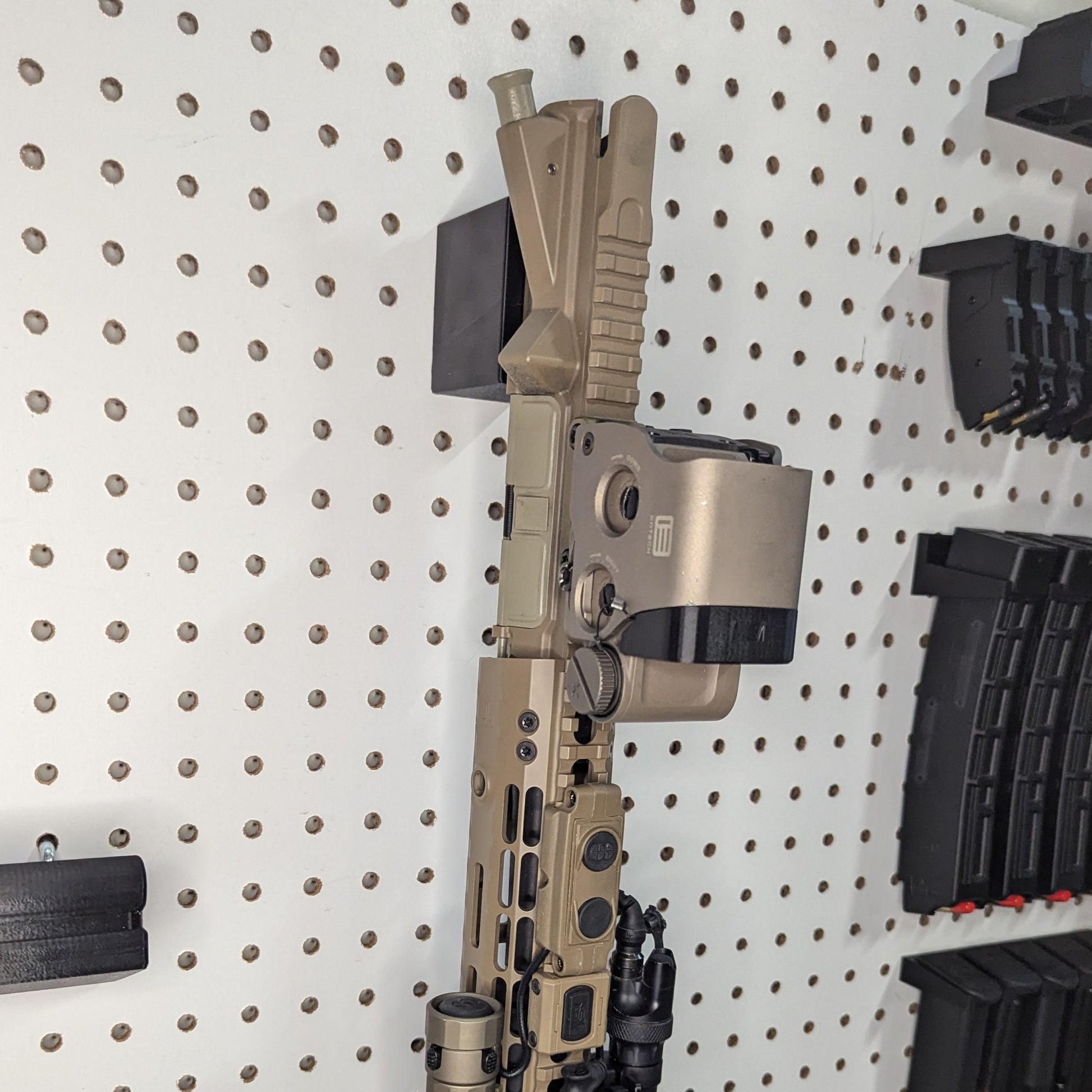 The non-metal and metal pegboard designs are based around standard pegboard with 1/4" holes spaced 1" apart. NOTE: Wall Control in particular is troublesome to get the mounts that use metal hooks lined up properly. It will require some finagling, and may require filing or entirely snipping off the printed pegs/nubs on the back of the mount. This will not affect the structural integrity of the mount. The mount will be more susceptible to falling off when the rifle is removed and upward pressure is applied to the mount. This is a shortcoming of standard 1/4" pegboard.