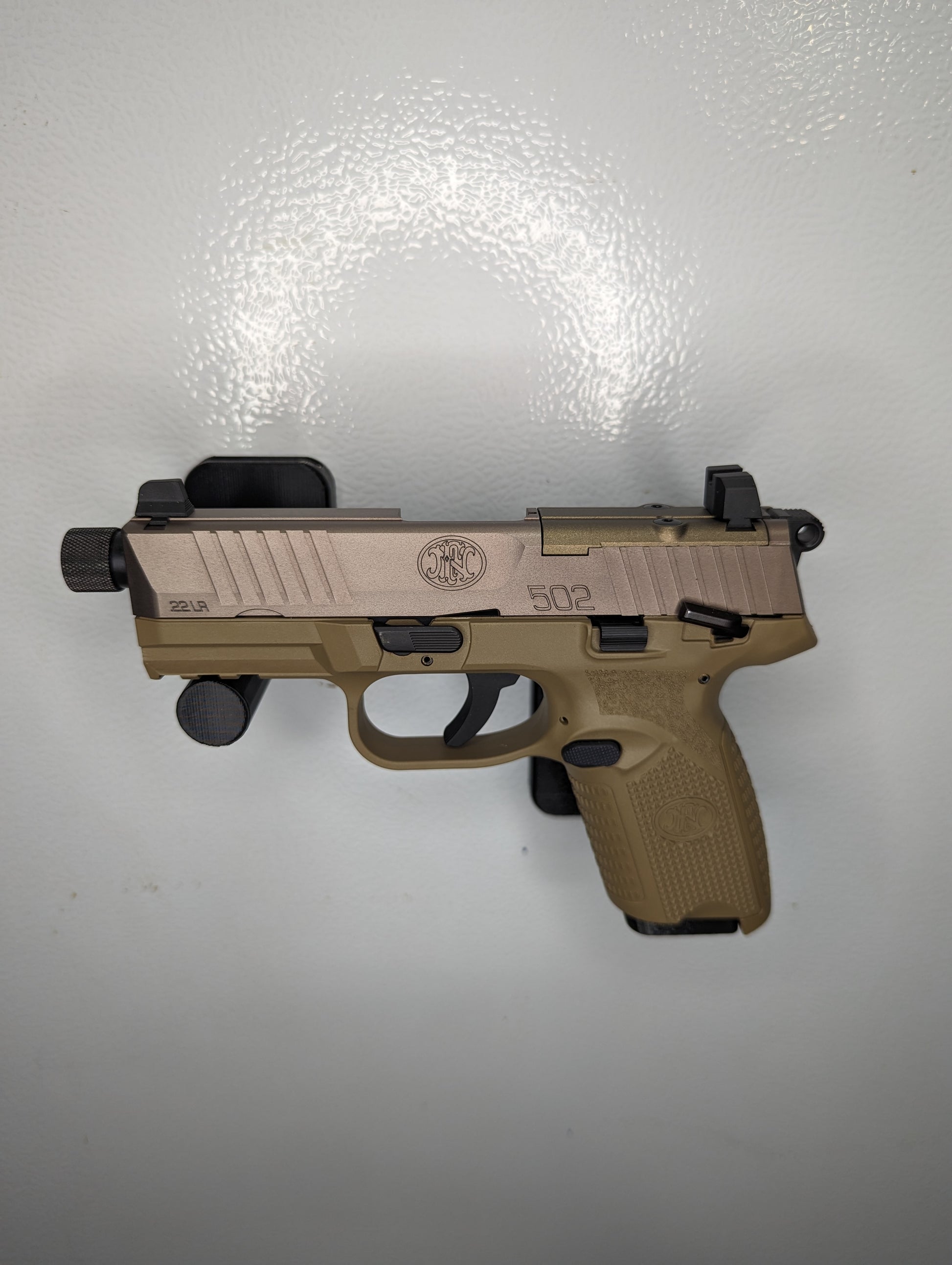 - Perfect Fit:  Works with an FN 502 Tactical 22LR pistol. This mount does not latch onto the mag catch, so the firearm can be lifted on and off without activating it, while still being held secure