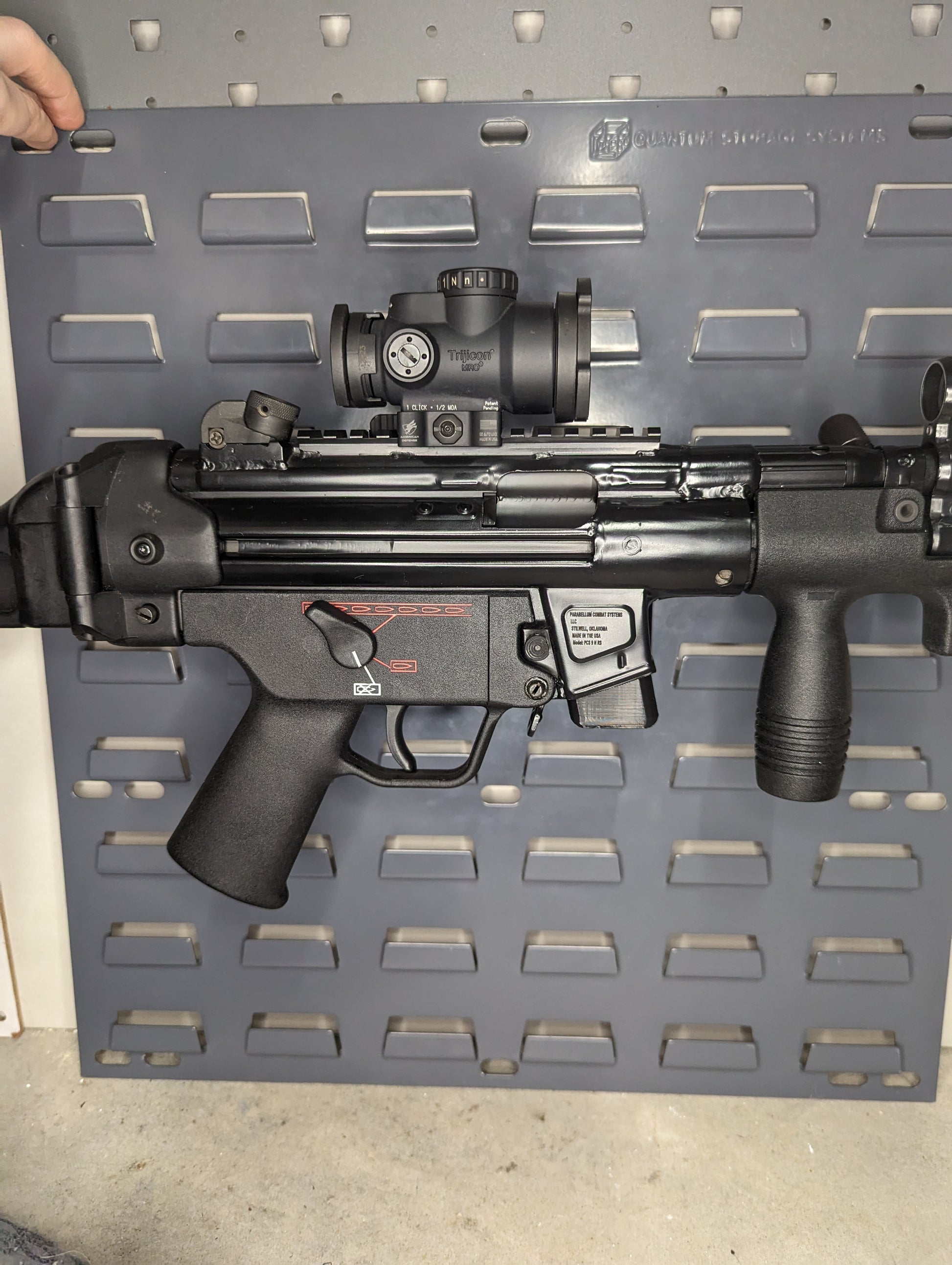 - Perfect Fit: Works with an MP5 / MP5K chambered in 9mm, such as the HK SP5, and all 9mm models from Dakota Tactical, Parabellum Combat, POF, Zenith, Century Arms, etc. The standard version does not latch onto the mag catch, allowing you to remove the firearm without pressing the mag catch. For the latching version, the mag catch must be activated to remove the firearm from the mount. The Inline Vertical version latches onto the mag catch and holds the firearm perpendicular to the mounting surface to allow for high-density storage.