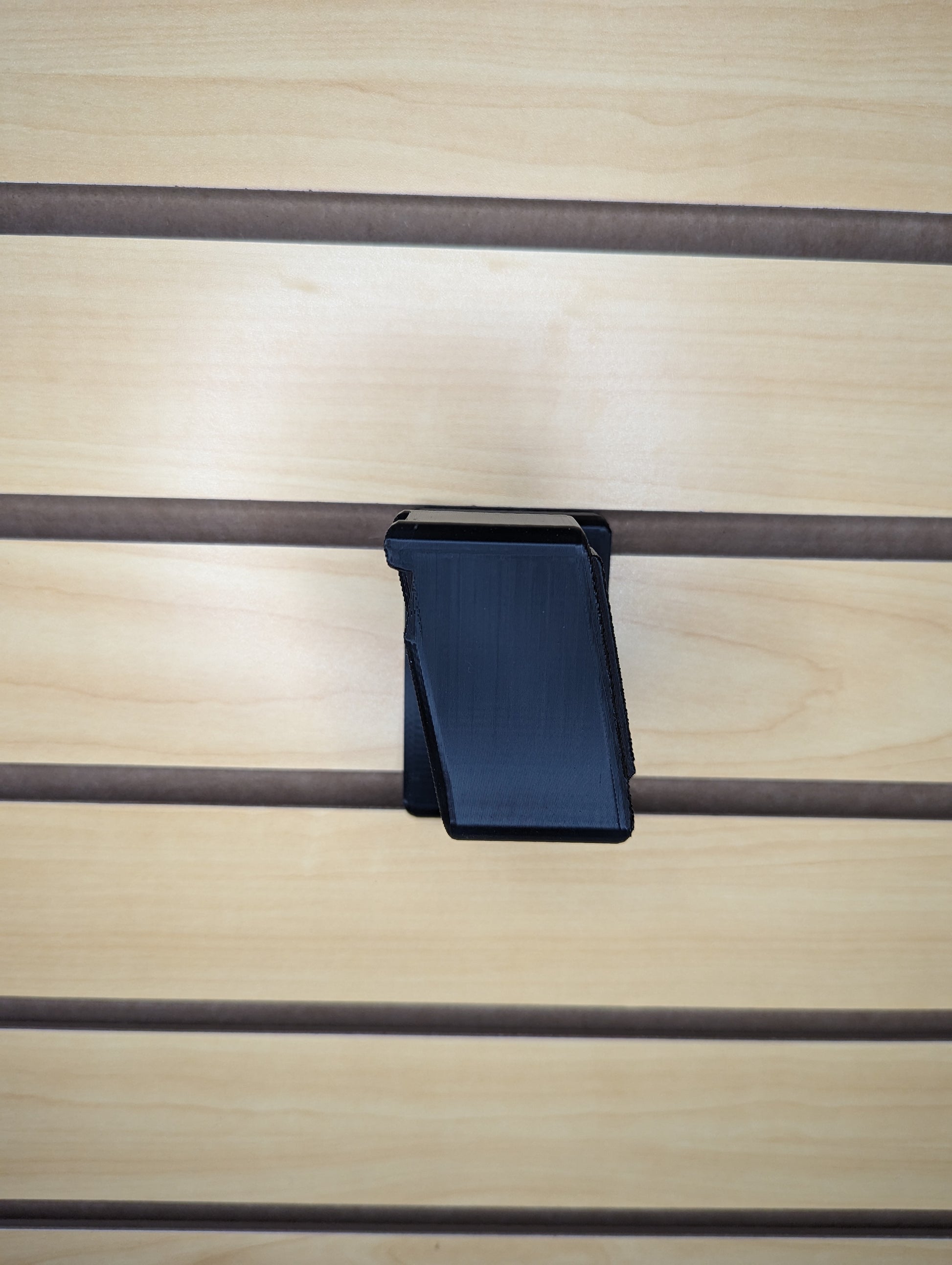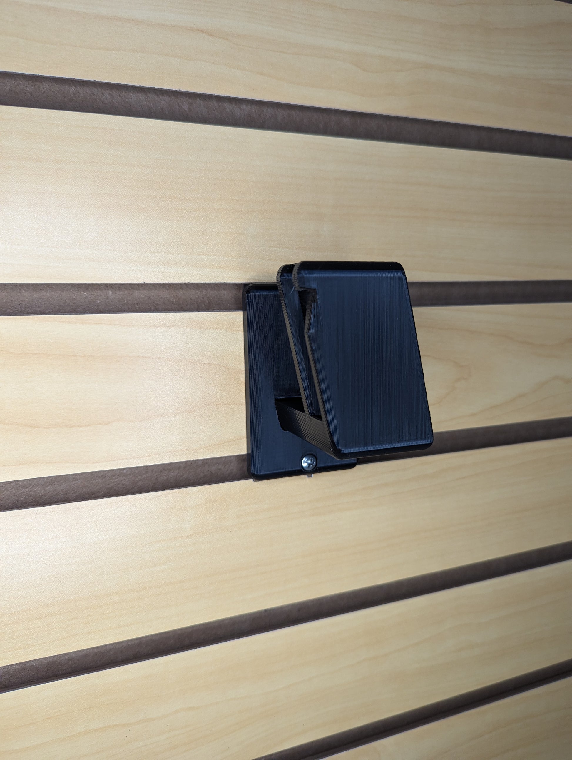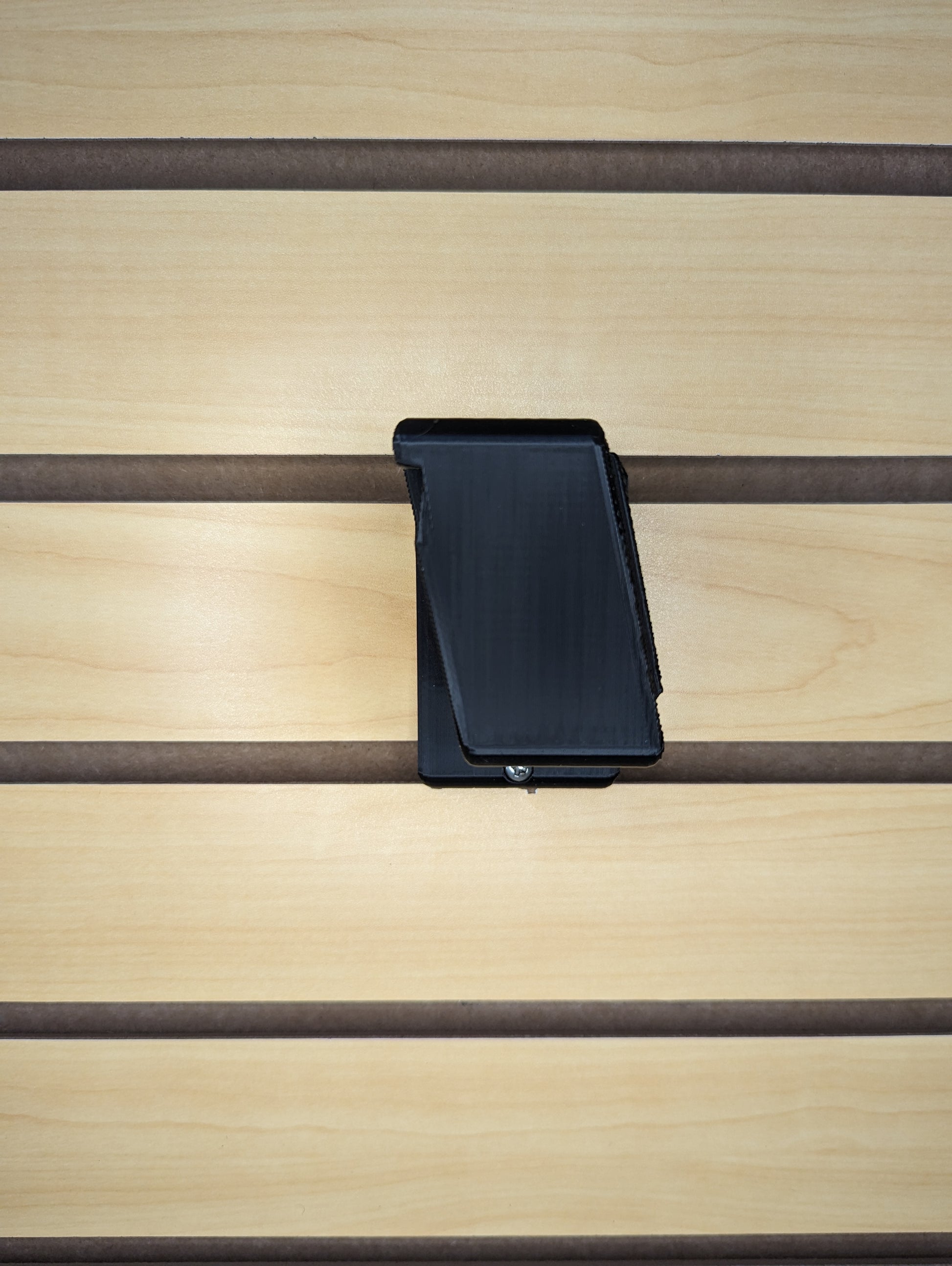 - Simple, Secure Mounting: Attaches to Slatwall via hook on the back of the mount and included printed T-nut and screw on bottom of mount. Insert printed nut into Slatwall slot underneath where you will place the hooked part of the mount. Rotate the nut 90 degrees to lock it into place. Then hook the mount into place and insert the screw through the bottom hole and into the printed nut. Tighten the screw to secure the mount to the slatwall.