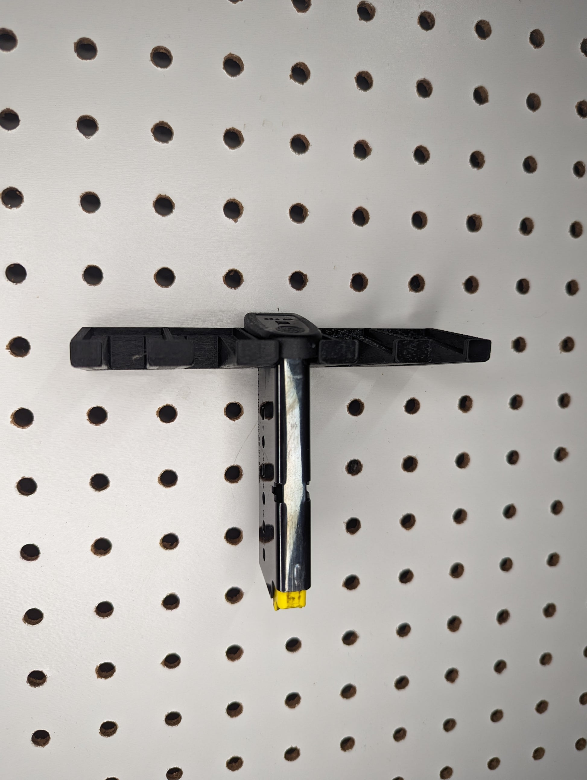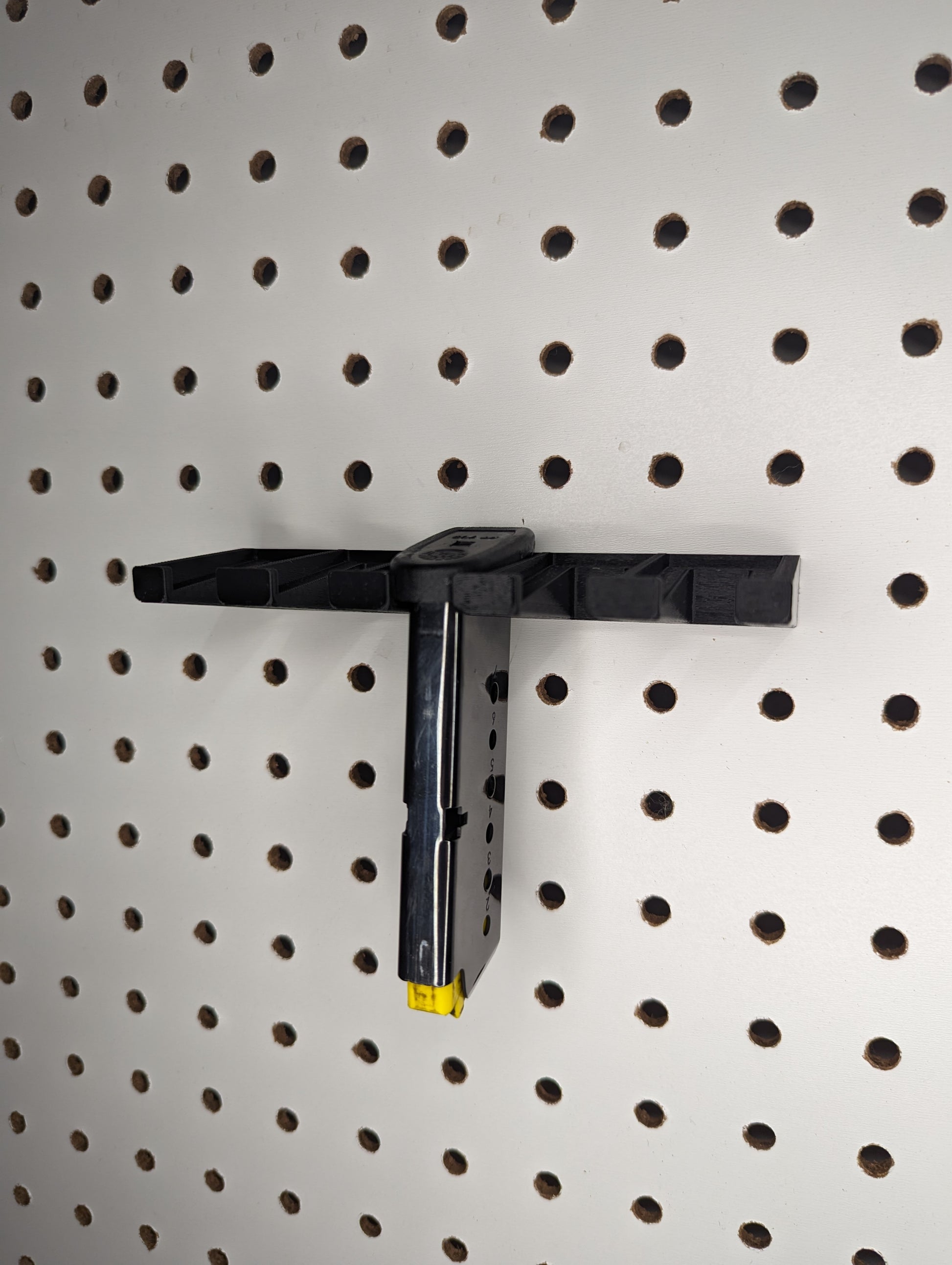 - Low Profile, Sleek Design: Proudly display your collection and make your mags easy to access. The mount sits flush with the pegboard and holds the mags for easy retrieval.