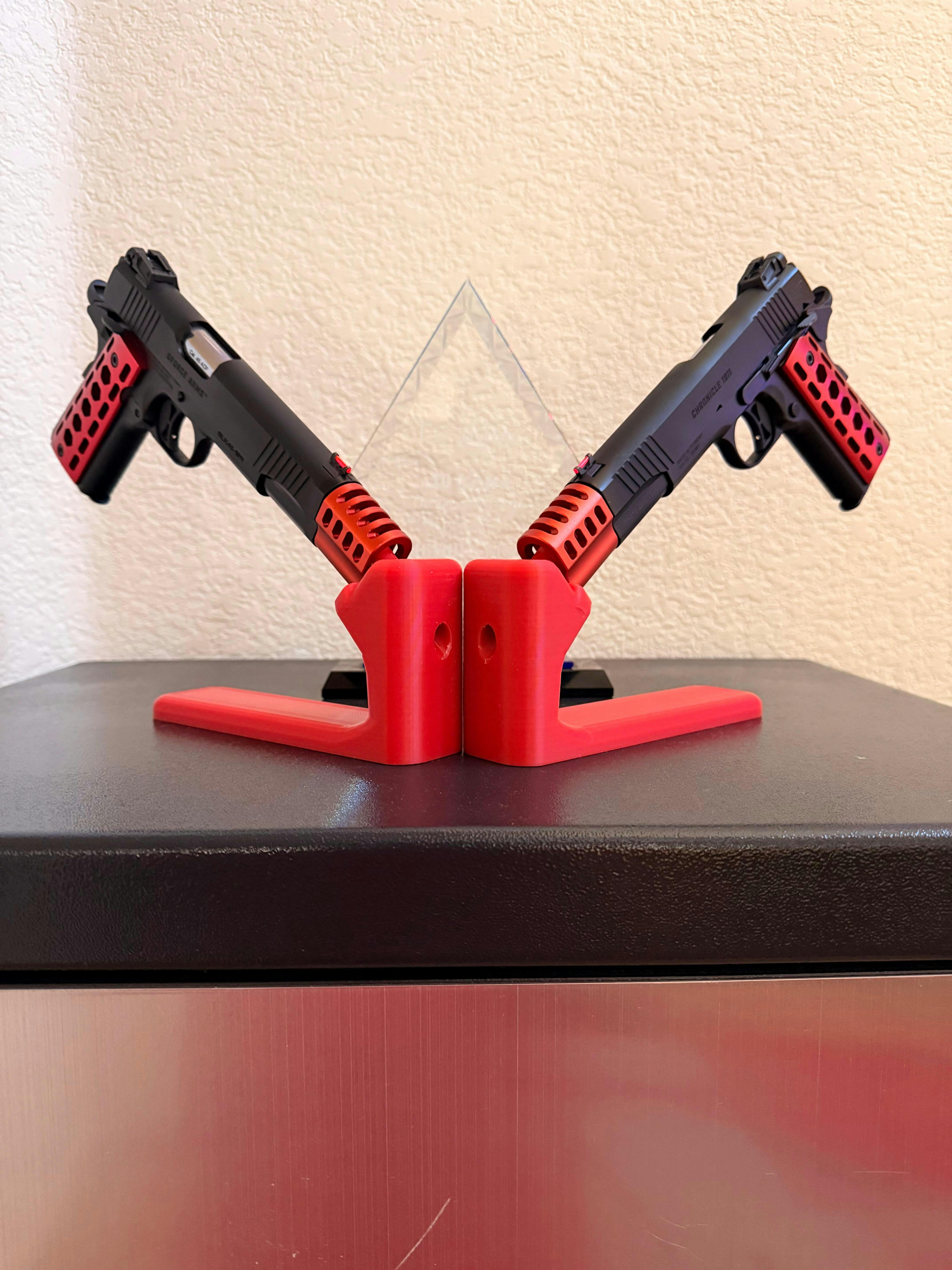 Triple version is also available here: https://hammy3dprints.com/products/triple-pistol-stand-tabletop-mount-handgun-holder-storage-rack
