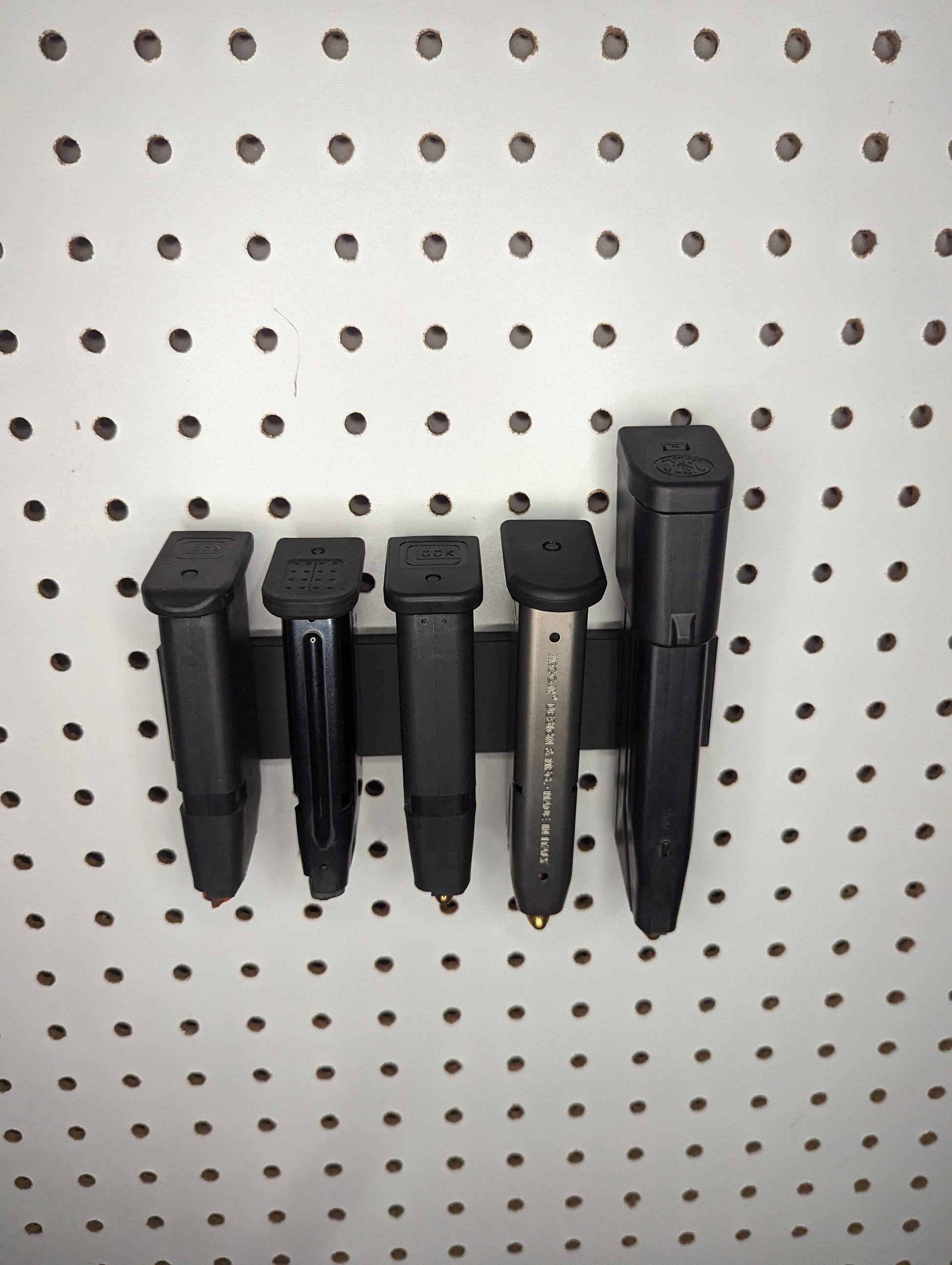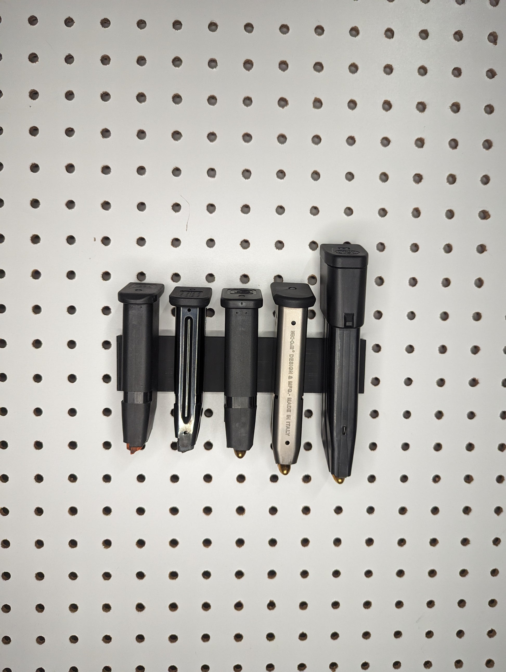 - Low Profile, Sleek Design: Proudly display your collection and make your mags easy to access. The mount sits flush with the pegboard and holds the mags for easy retrieval.