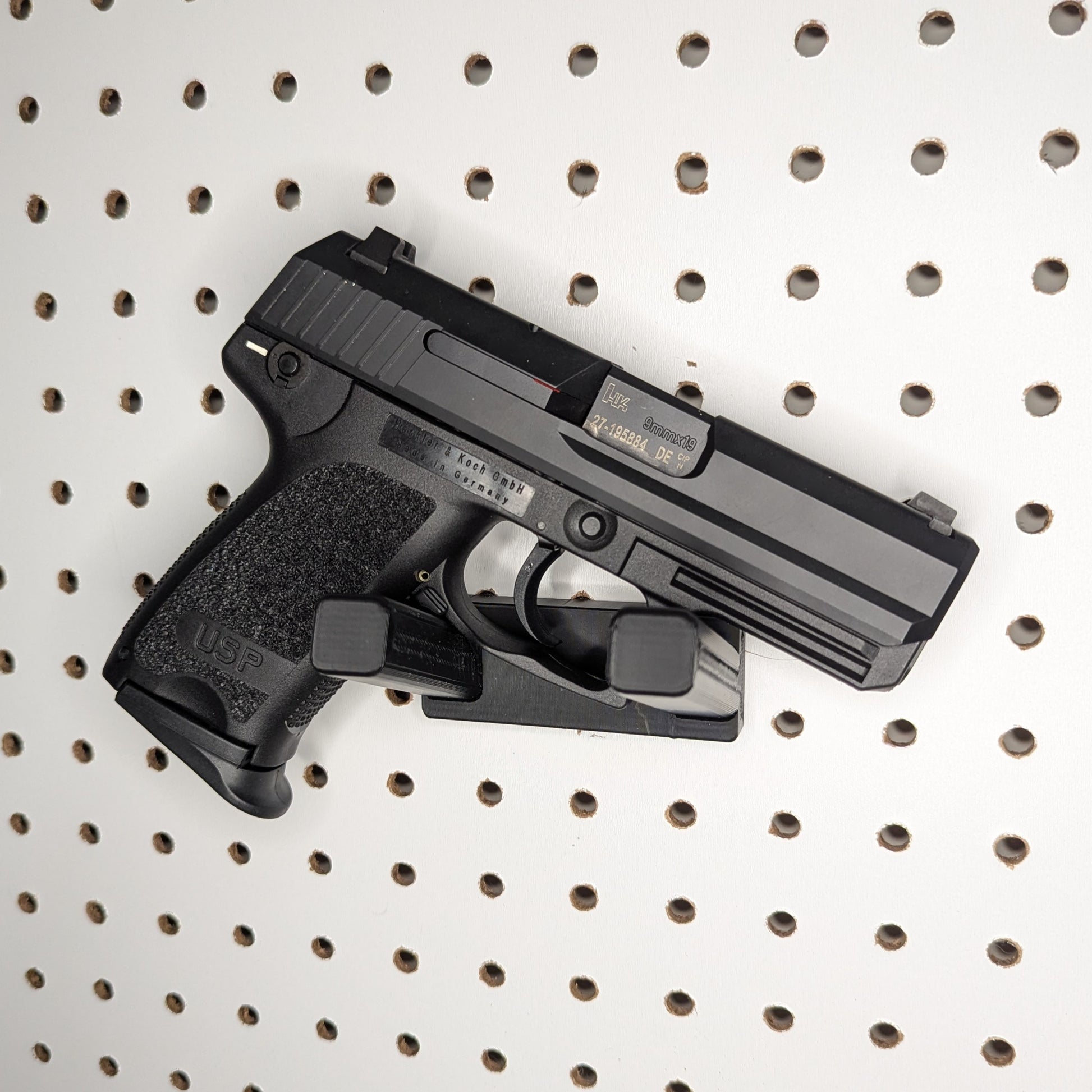 - Simple, Secure Mounting: Attaches to pegboard via hooks on the back of the mount. Heavy-duty mount holds firearm with ease.