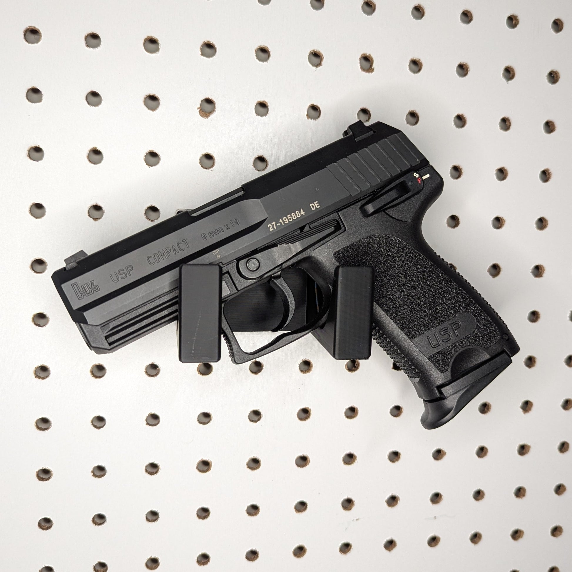 - Simple, Secure Mounting: Attaches to pegboard via hooks on the back of the mount. Heavy-duty mount holds firearm with ease.